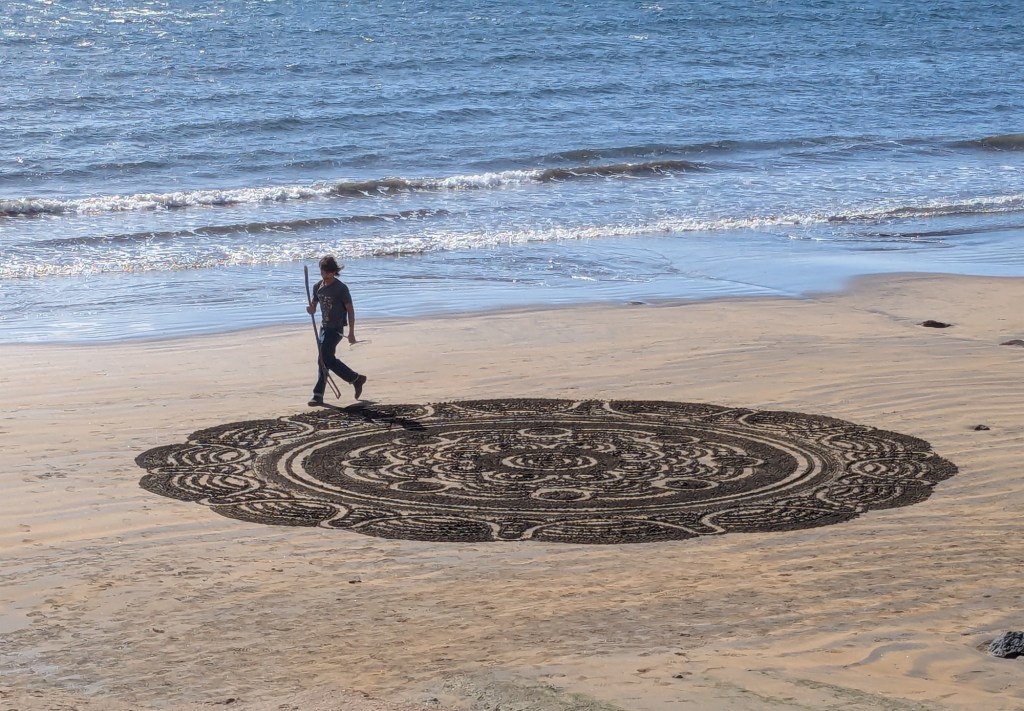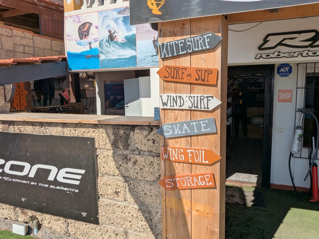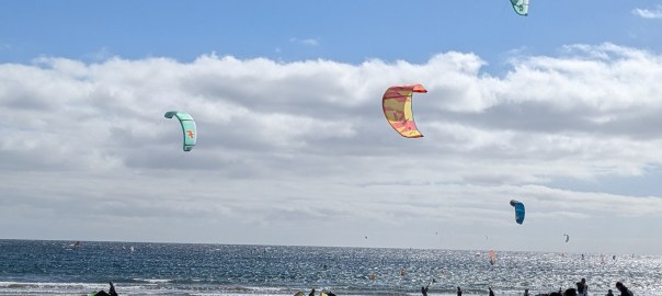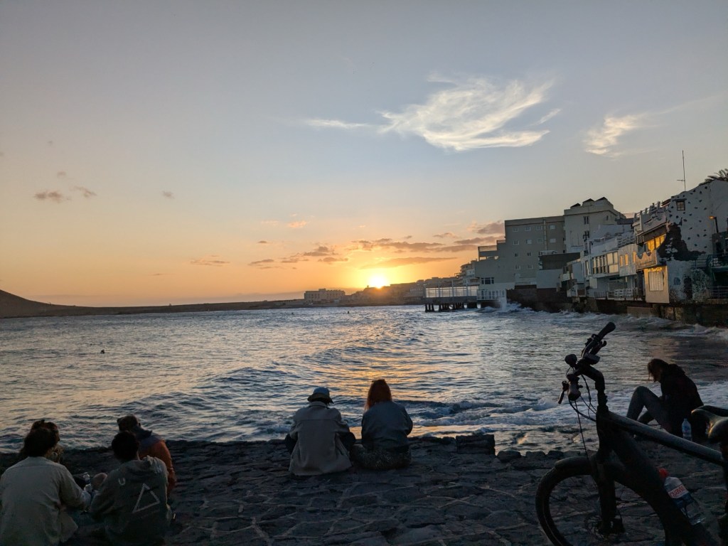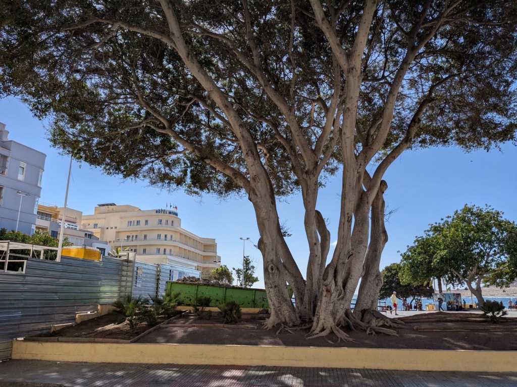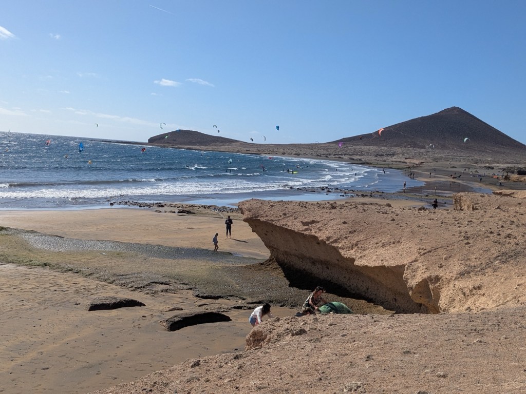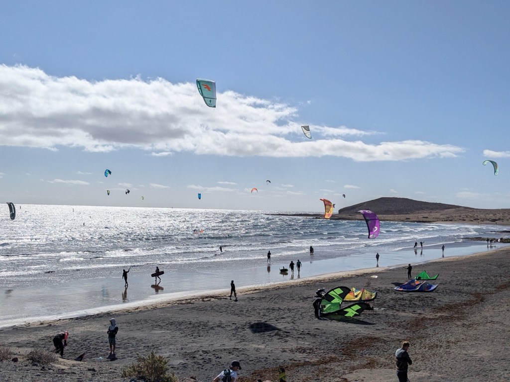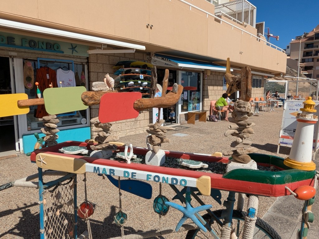 The little tourist town of El Médano is on the southern end of Tenerife and is all about any sport that favors a windy beach. Kite surfing and wind surfing are mostly what we see. There is a constant wind of 15 – 20mph.Lots of folks soaking up the sun and getting their feet wet, and a few brave swimmersThe serious surfers wear wetsuitsLots of fit Germans in shorts that show off their bulging calf muscles and lots of considerably flabbier Brits are in evidence here. Also French and Italians, in smaller numbers.Which way is the wind blowing? These artsy devices seem to agree that the winds blow from the eastOne industrious soul creates a Mandela that will soon be erased by the wind and waterThe surf carves ridges that sunbathers use as windbreaks. The sand is darker and more densely packed than our beaches – the sand doesn’t get in your shoes!Where the boardwalk ended we found the trail that will take us up Montaña Roja (Red Mountain), but we didn’t climb it todayBack to town for a smoked salmon poke bowl – some restaurants here follow the Spanish custom of closing in the afternoon for siesta, while others open at 2pm, so we can always find something to eat.Here’s an odd carving…After supper we walked to the place where everyone gathers to watch the sunset.A lovely day!