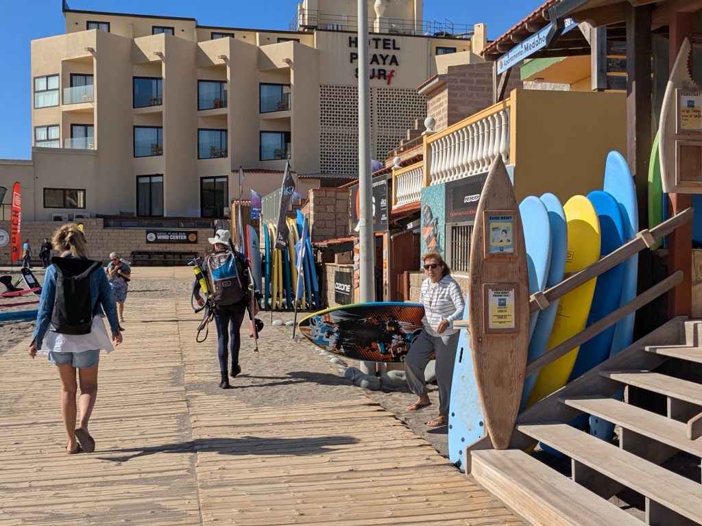 Feb 3 – Customs was a breeze, we found an ATM right outside the airport, then tried to find the right place to stand for the #10 bus to get us into town. We stood under a big sign that said “#10”, but after two #10s flew past us without stopping, we figured we needed a better plan. We figured it out eventually, and two buses later, we are here in El Médano.