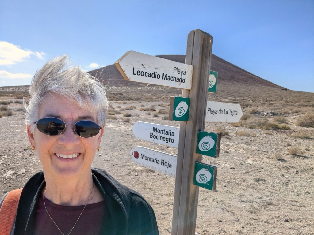 Feb 7 – can we top yesterday’s adventure for sheer excitement? I don’t think so, nor do I want to! Today we are walking up the teeny weeny elevation next to yesterday’s Montaña Roja. It is also called a mountain, but it’s just a bump in the landscape. The sign tells us it is called Montaña Bocinegro, literally the Black Horn, also the local name for the sea bream, a popular and plentiful Atlantic fish.