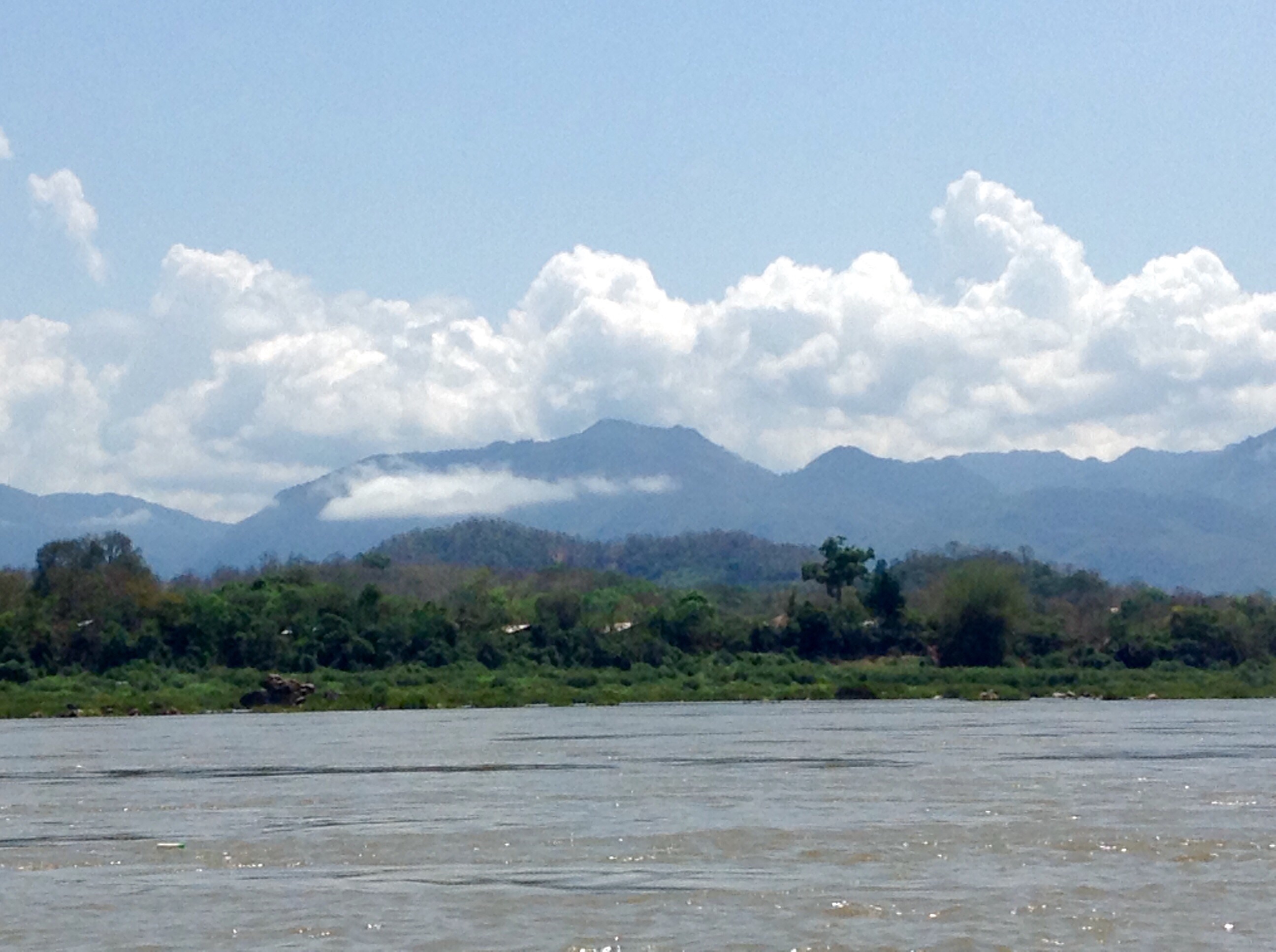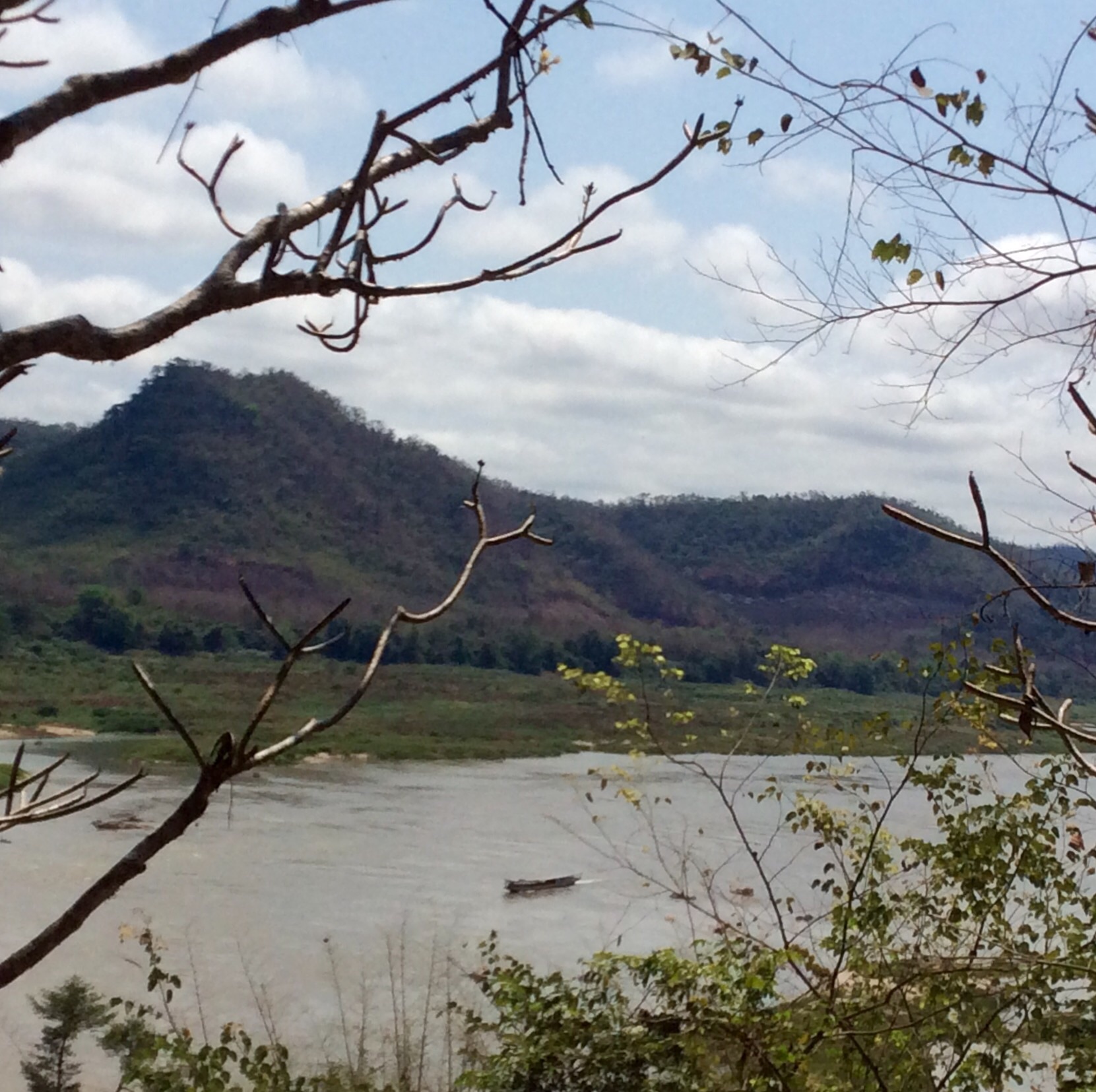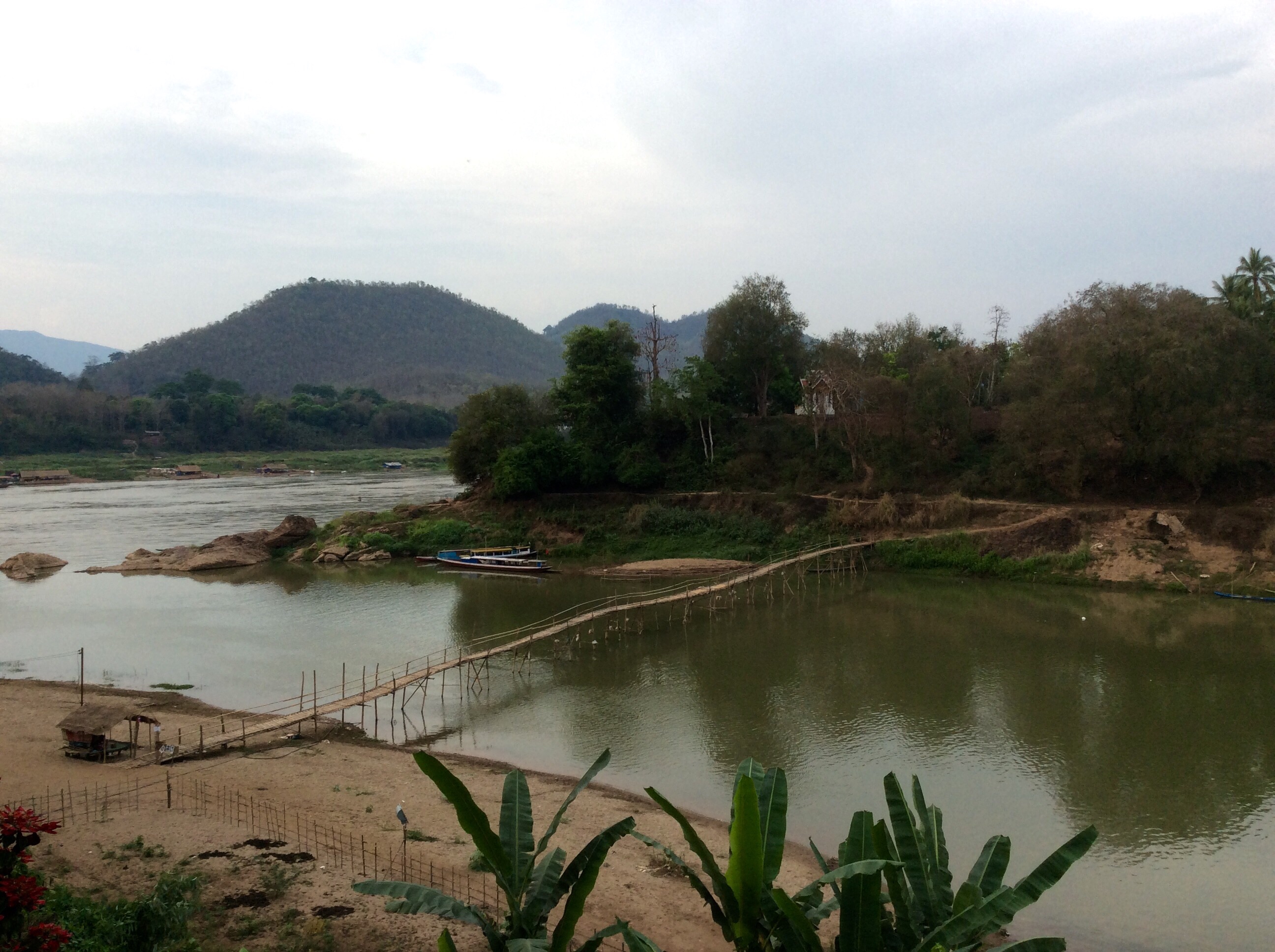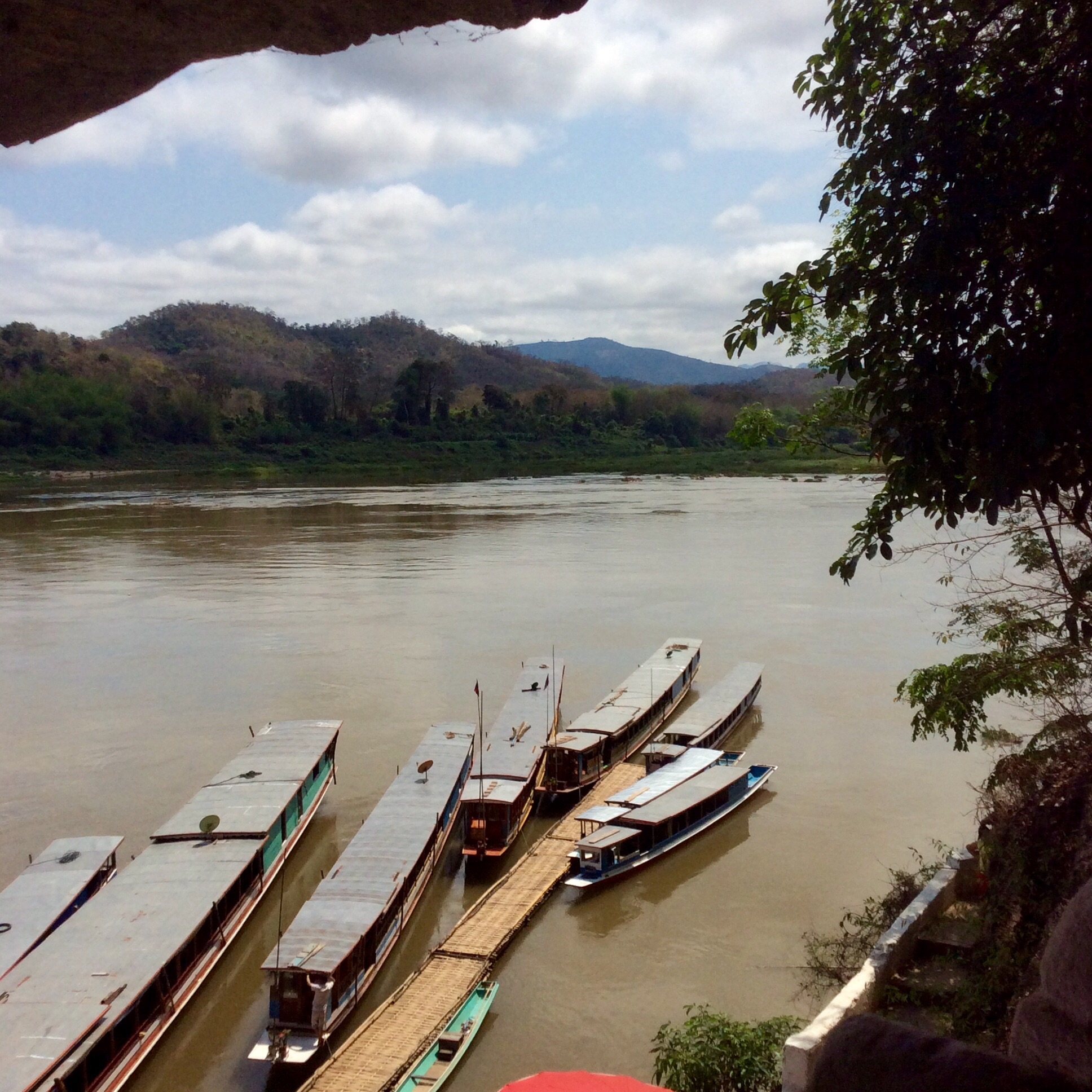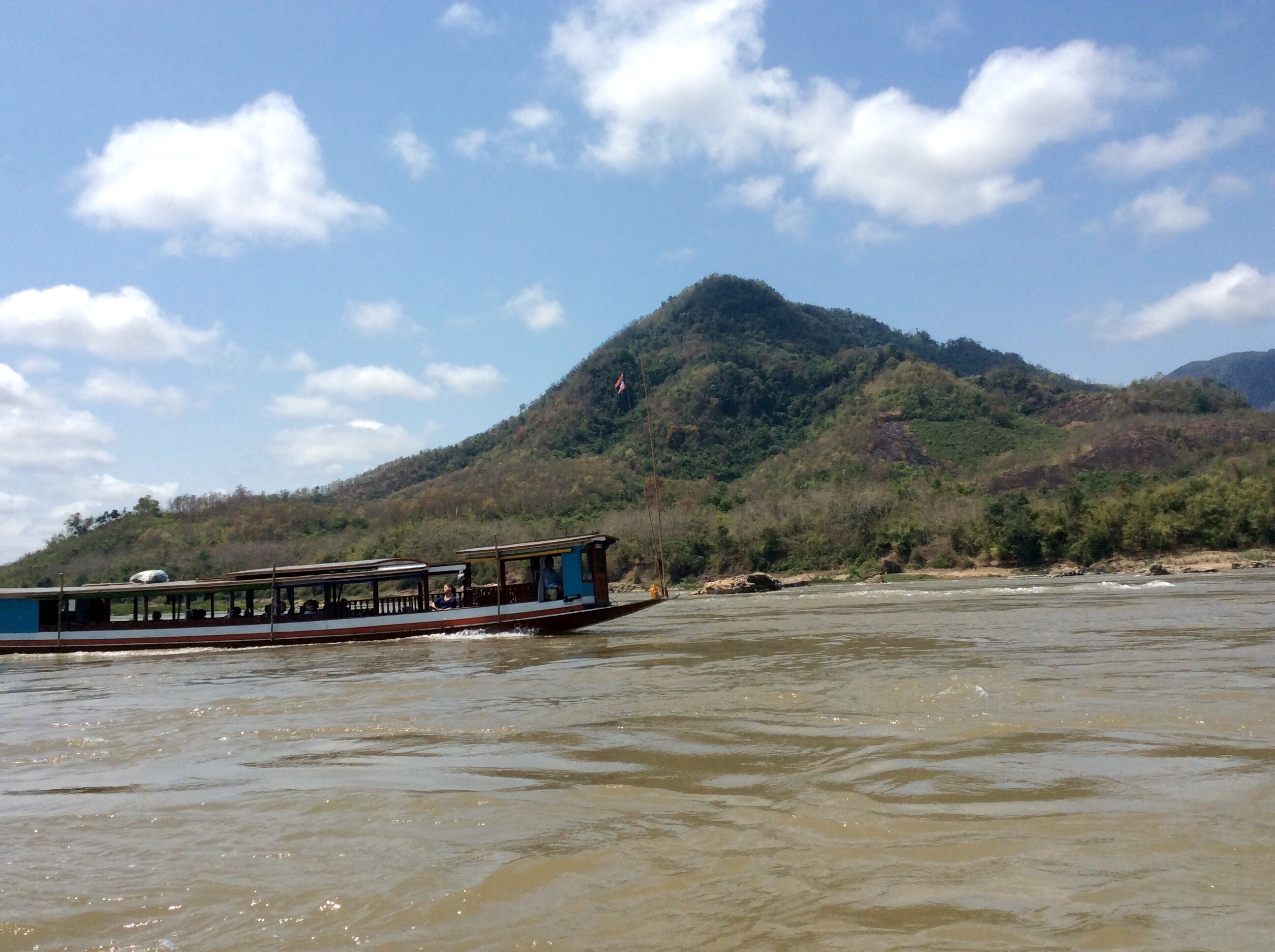 3/28 – This morning we had an early breakfast so we would be ready for our tuk-tuk at 8am. We are taking a two hour tourist slow boat up the Mekong River to visit Whiskey Village, and see the Pak Ou Buddha caves. There are seven of us (two young women from Hanoi, a Spanish man from Barcelona, and a couple in the back that we never got to speak to) in the long boat, which is motor driven, so is not really that slow. The morning is overcast and it is actually a little chilly on the water.