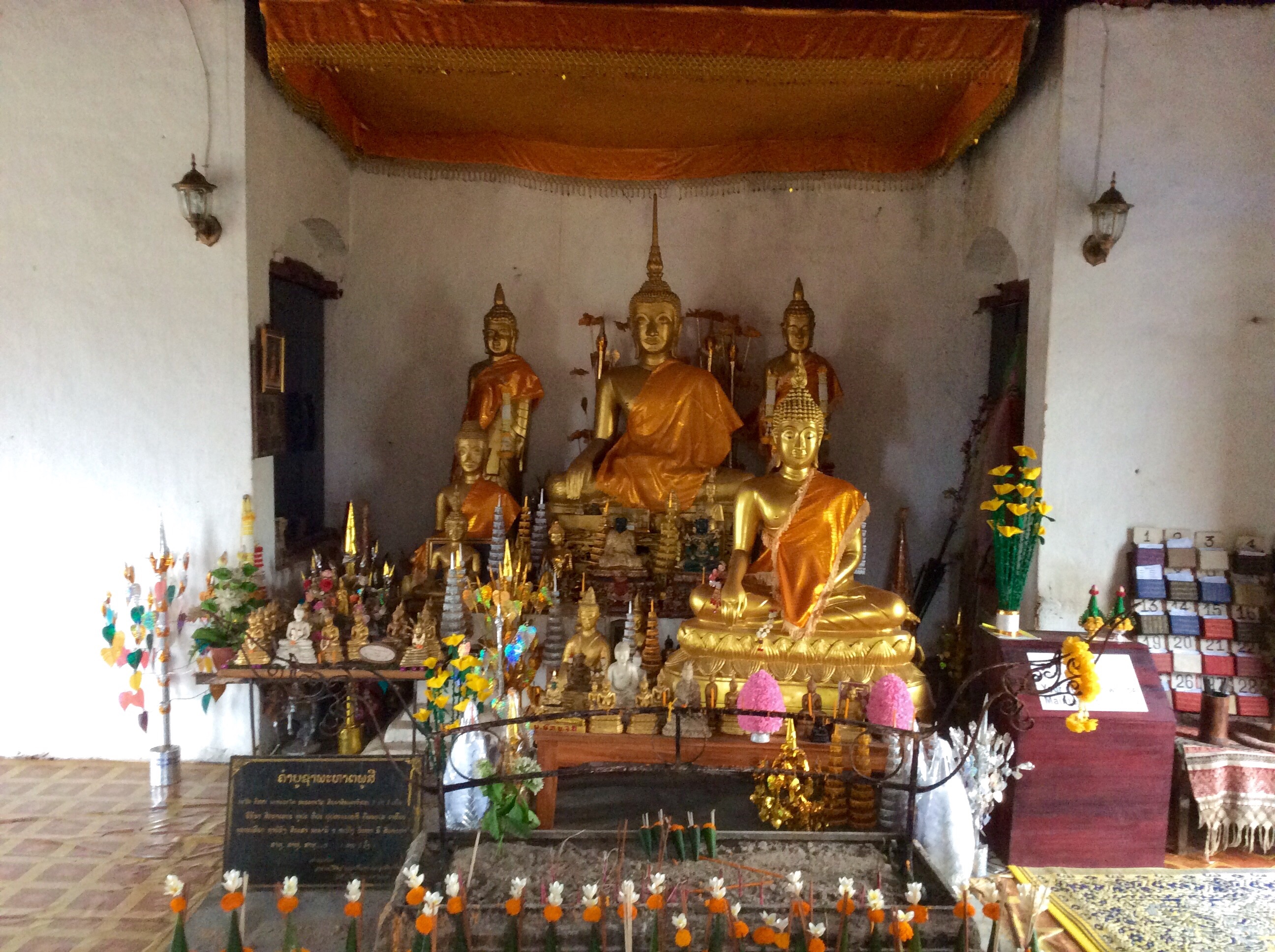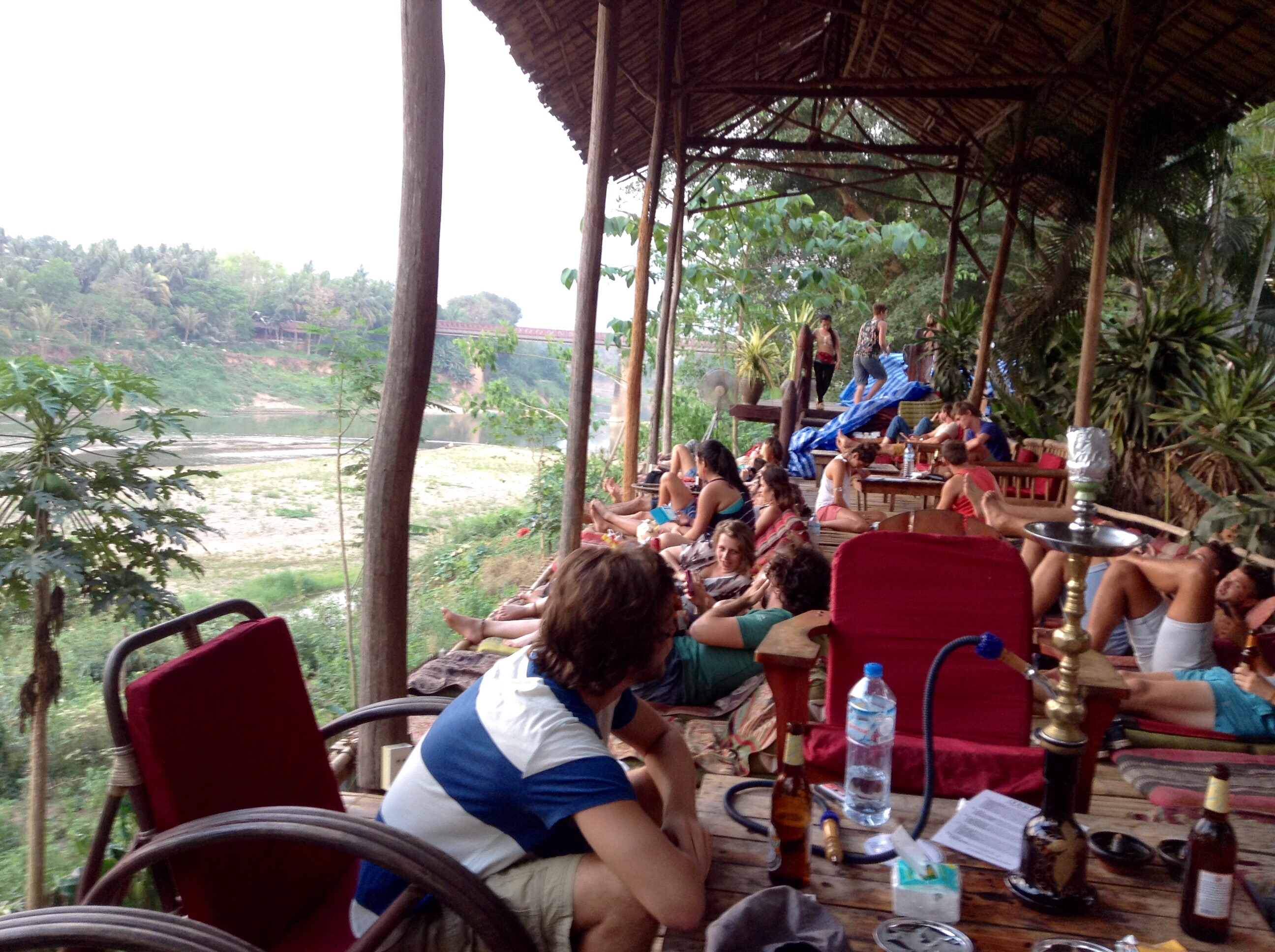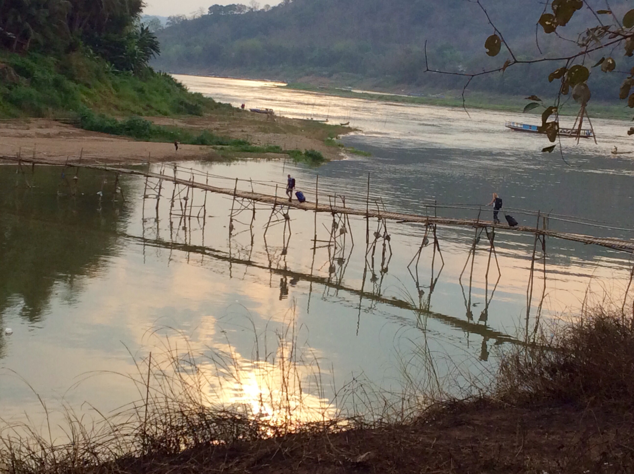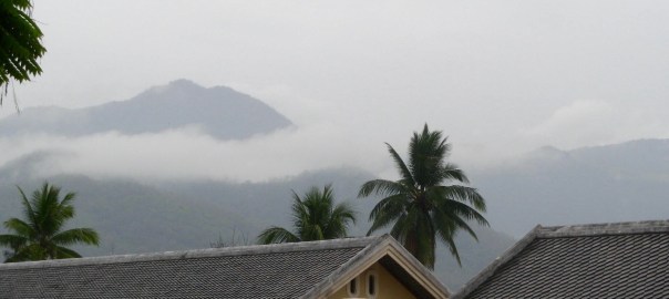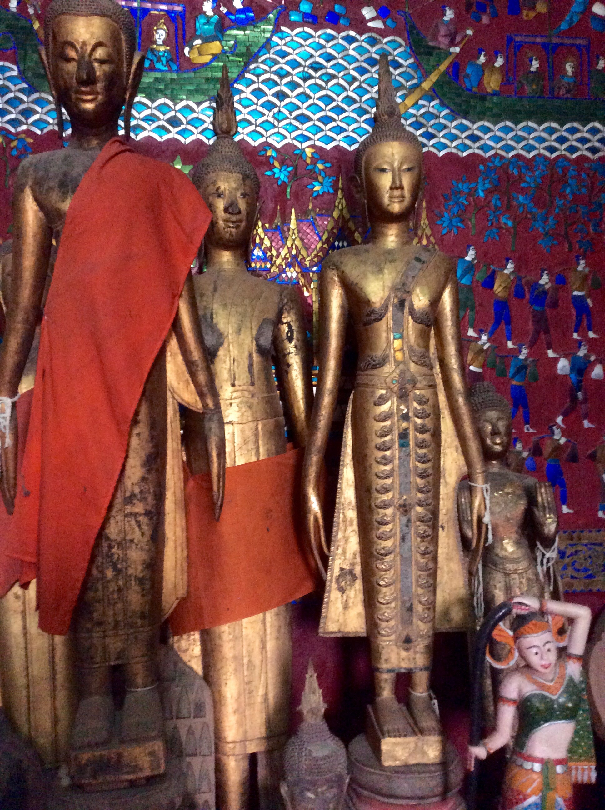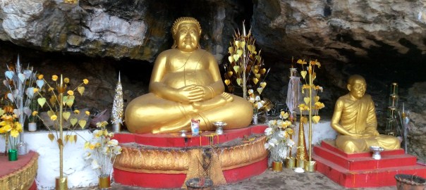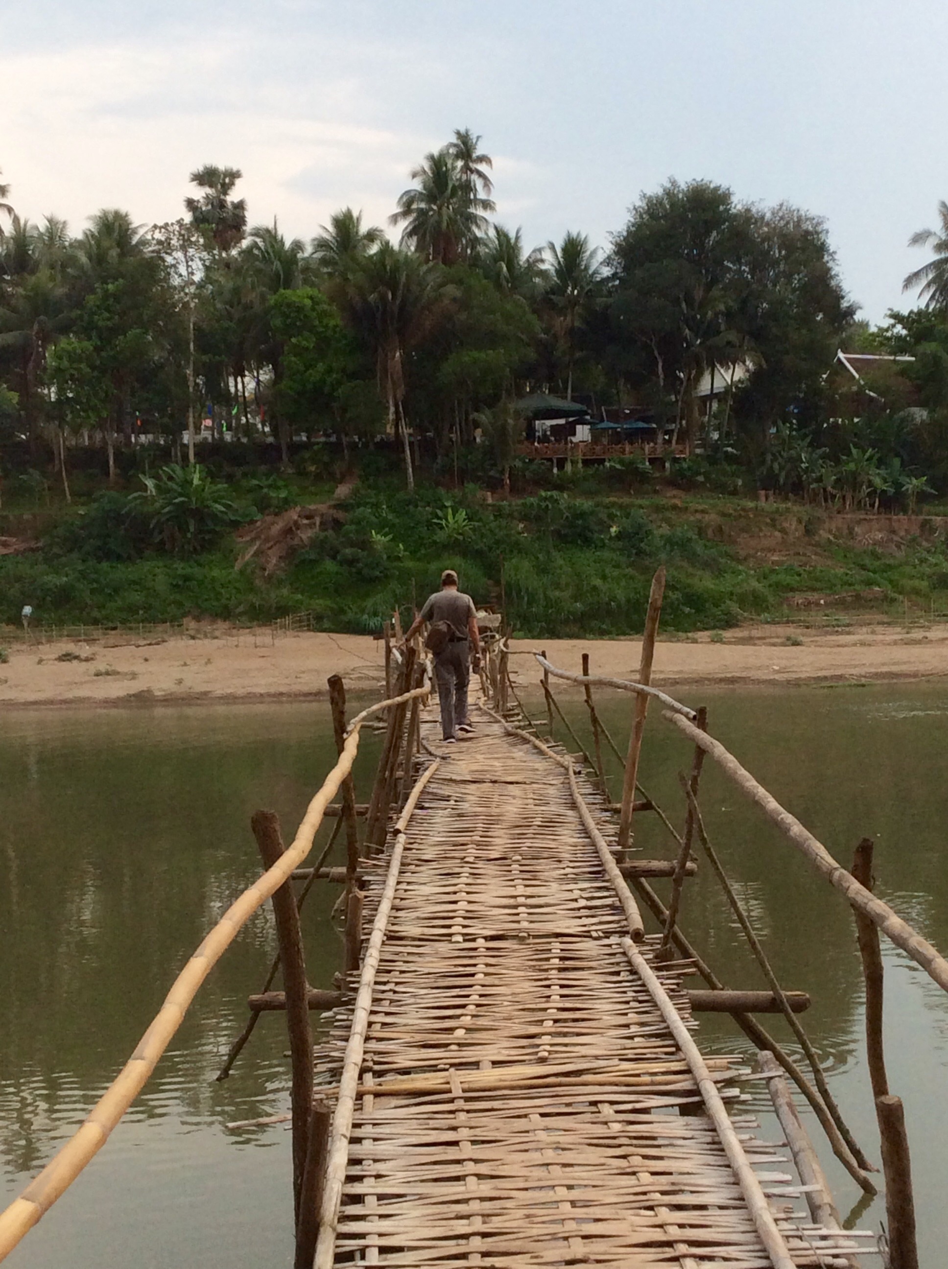 3/28 – This morning we had an early breakfast so we would be ready for our tuk-tuk at 8am. We are taking a two hour tourist slow boat up the Mekong River to visit Whiskey Village, and see the Pak Ou Buddha caves. There are seven of us (two young women from Hanoi, a Spanish man from Barcelona, and a couple in the back that we never got to speak to) in the long boat, which is motor driven, so is not really that slow. The morning is overcast and it is actually a little chilly on the water.
