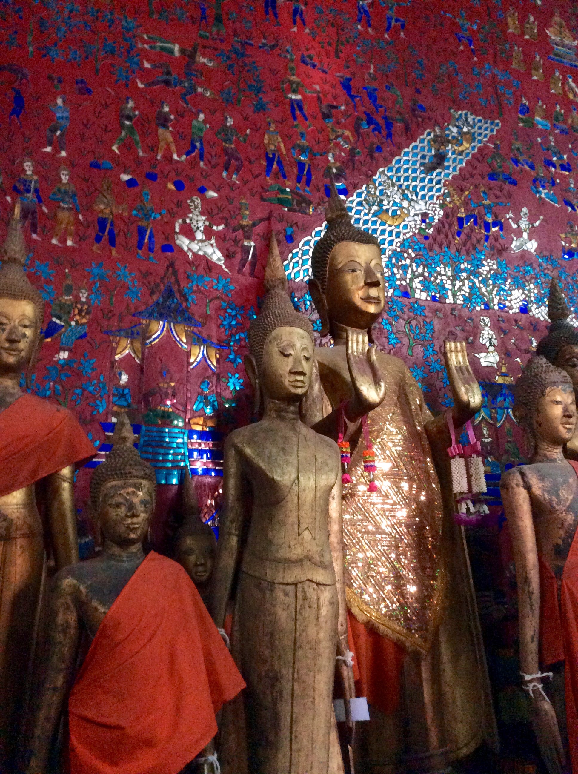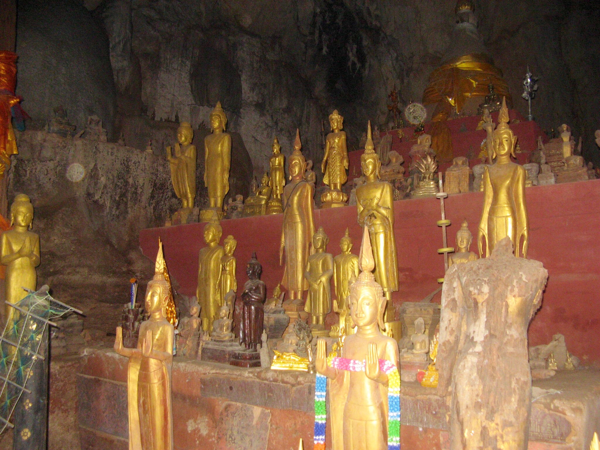 Now we continue our journey north to the Pak Ou caves, where a bamboo bridge and a set of steps brings us to the mouth of a cave filled with small Buddha statues, mostly made of wood, that people have been bringing here for over two hundred years.