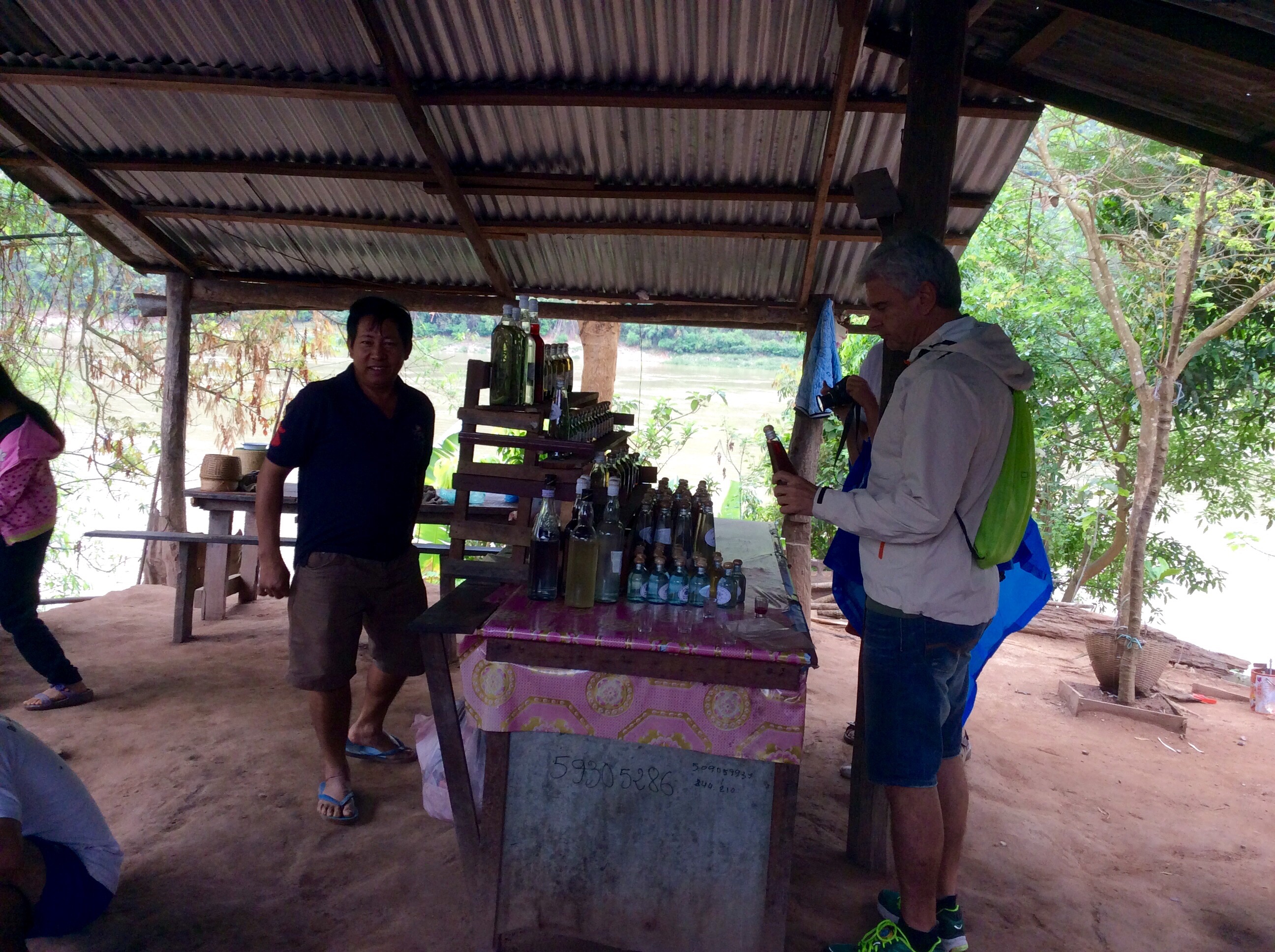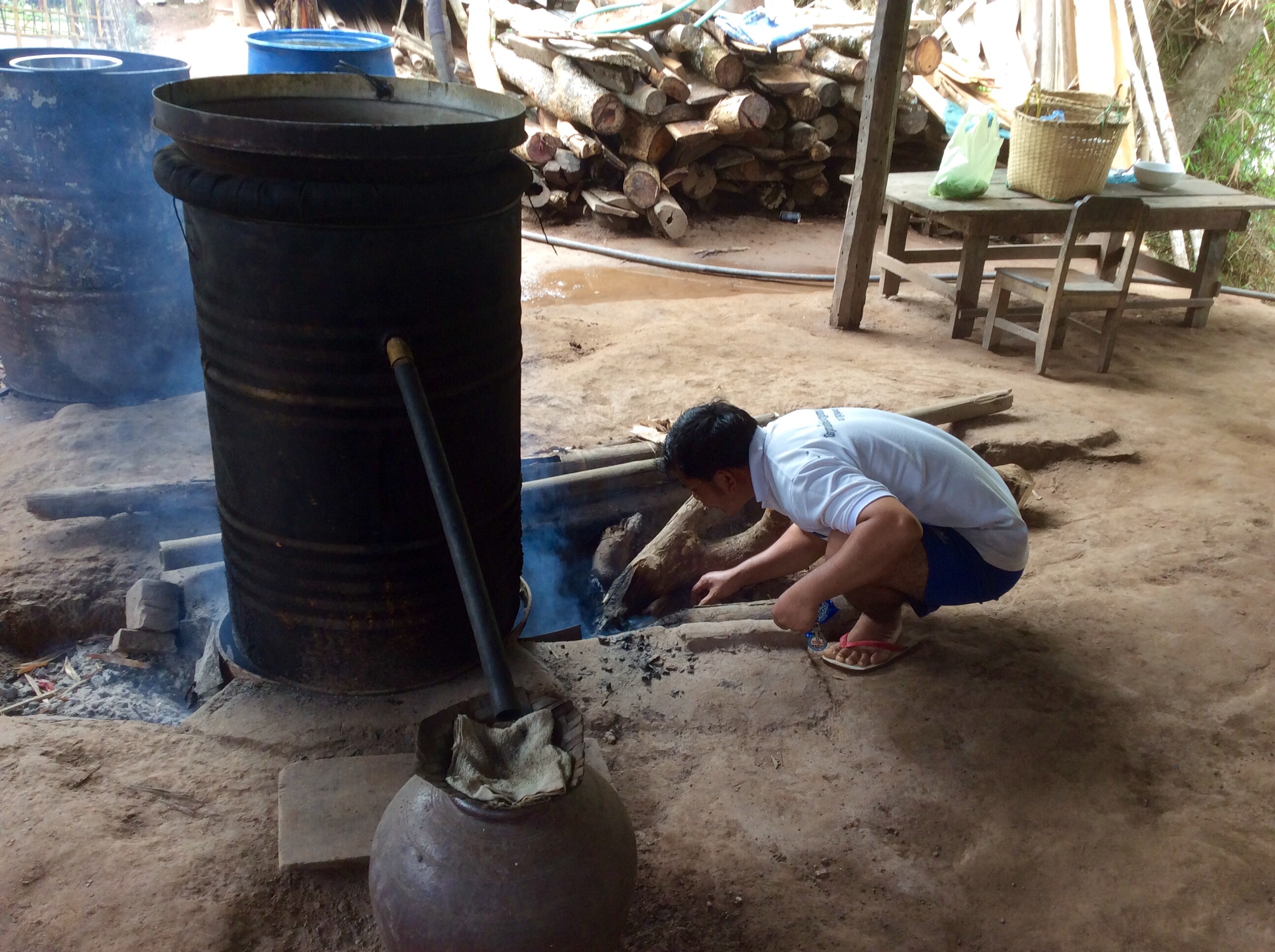 An hour and a half into our ride, the driver stops at a set of rickety steps, and we disembark and climb up to a tin-roofed shack containing a metal drum distillery heated by an open fire.
