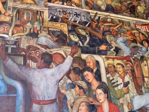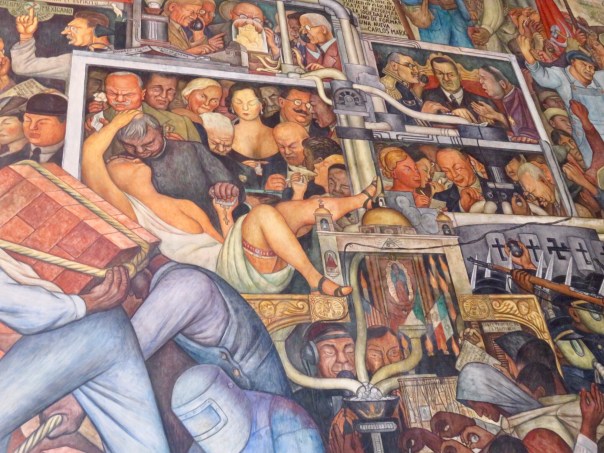 I listened to an English tour guide describing this one to his group. Karl Marx is at the top, like God. The pipes are filled with the blood of the Mexican workers, which turn into money for the government at the bottom. The priest kissing the prostitute on the left represents the corruption of the Church, which should be helping the people, and likens the Church to the Nazis by showing the line of crosses with a swastika included on the right.