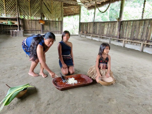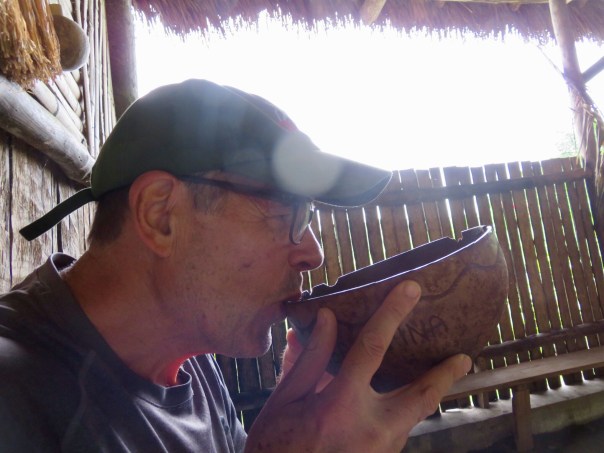 In another recipe, the manioc is chewed by all the women, then spit back into a communal bowl where it ferments for several days or weeks, then used as an intoxicant. We were offered some wayusa.