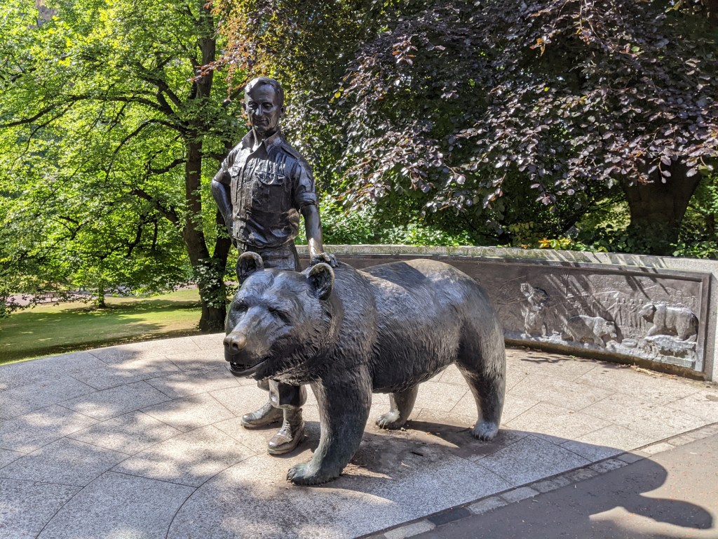 Below is the statue commemorating Wojtek, a brown bear that served with the Polish troops who fought alongside the Brits in WWII, carrying 100 pound boxes of ammunition. After the war he was brought to Scotland, where he lived the rest of his life at the Edinburgh Zoo.