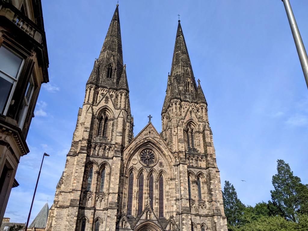 Glasgow, known as the Merchant City, is a working class city that doesn’t offer the range of touristy attractions that we had in Edinburgh. Don’t worry, we’ll find things to do. We set out this morning for a walk to the Glasgow Cathedral and Necropolis.