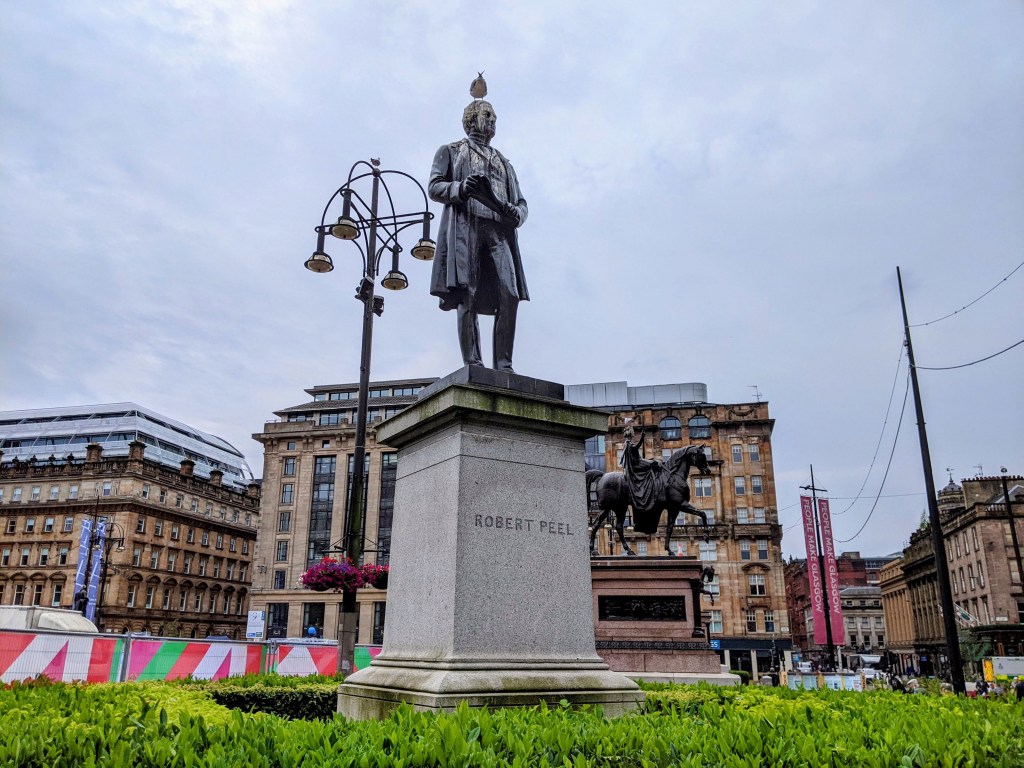 We stepped out of the Glasgow Queen St. station right onto historic George Square, laid out in 1781 and named in honor of King George III. The first thing we saw was a row of statues, some with traffic cones on their heads – how curious!