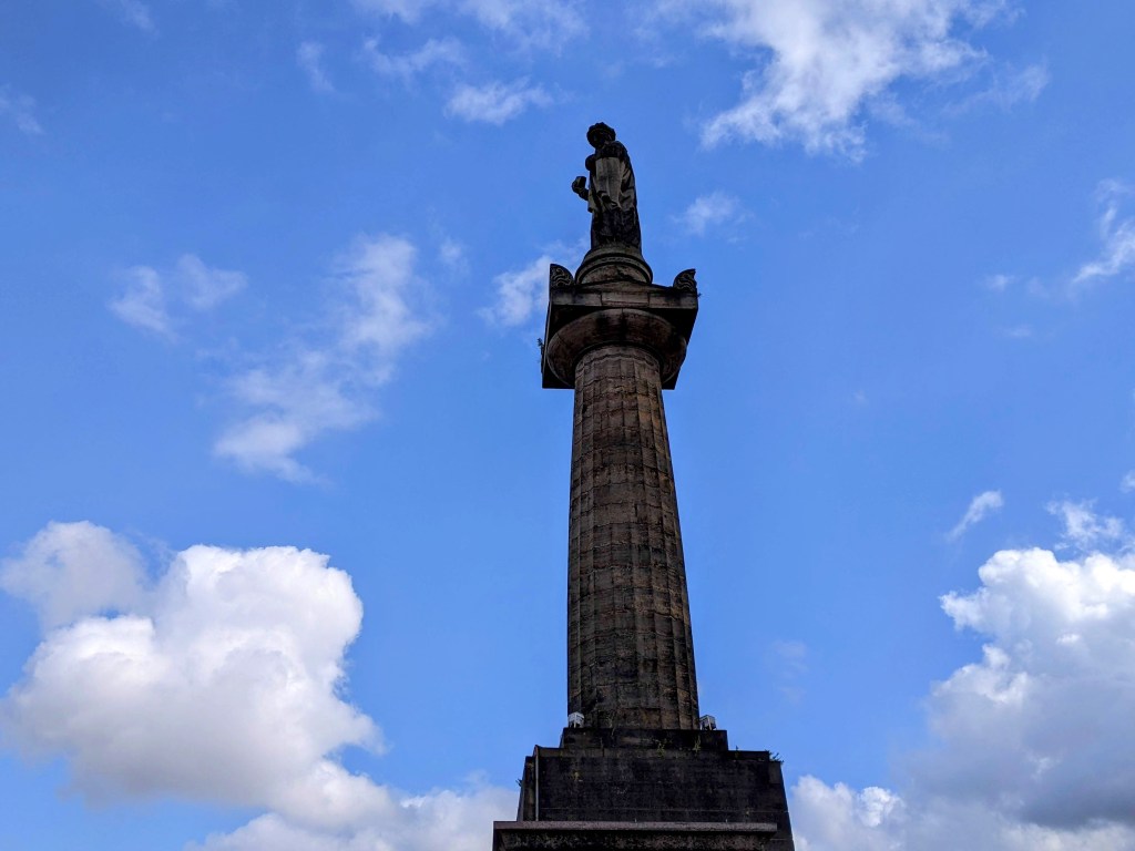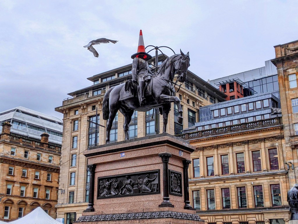 My Google search revealed that a traffic cone first appeared on the Duke’s statue back in the 1980s, and as fast as city workers removed it, it would reappear the next evening. The city threatened action against anyone defacing the statue, but the people of Glasgow rallied round the cause, and now the statue with cone (sometimes the horse has a cone too) appears on Glasgow tee shirts and post cards as a symbol of the city. I like a city that doesn’t take itself too seriously.