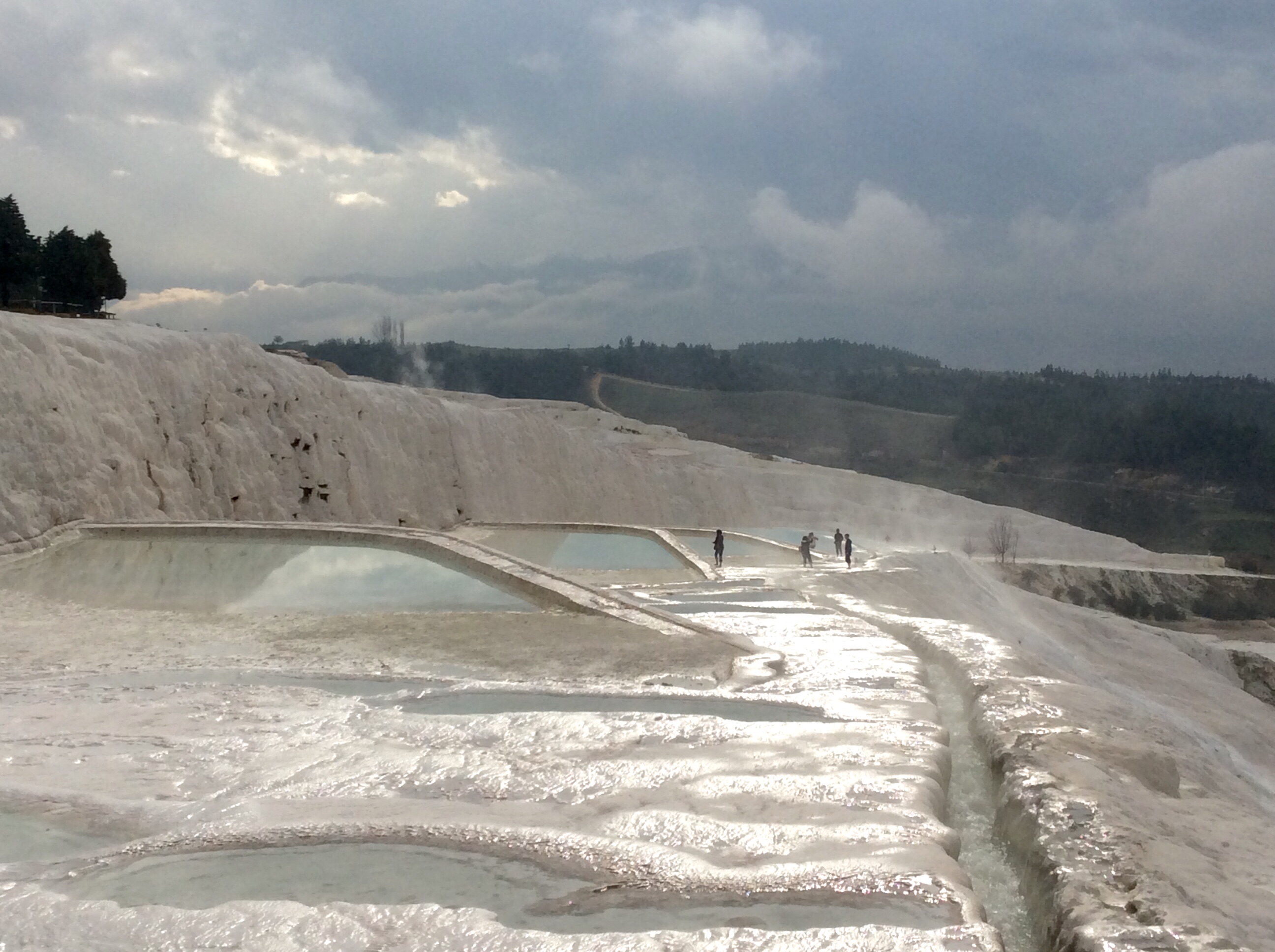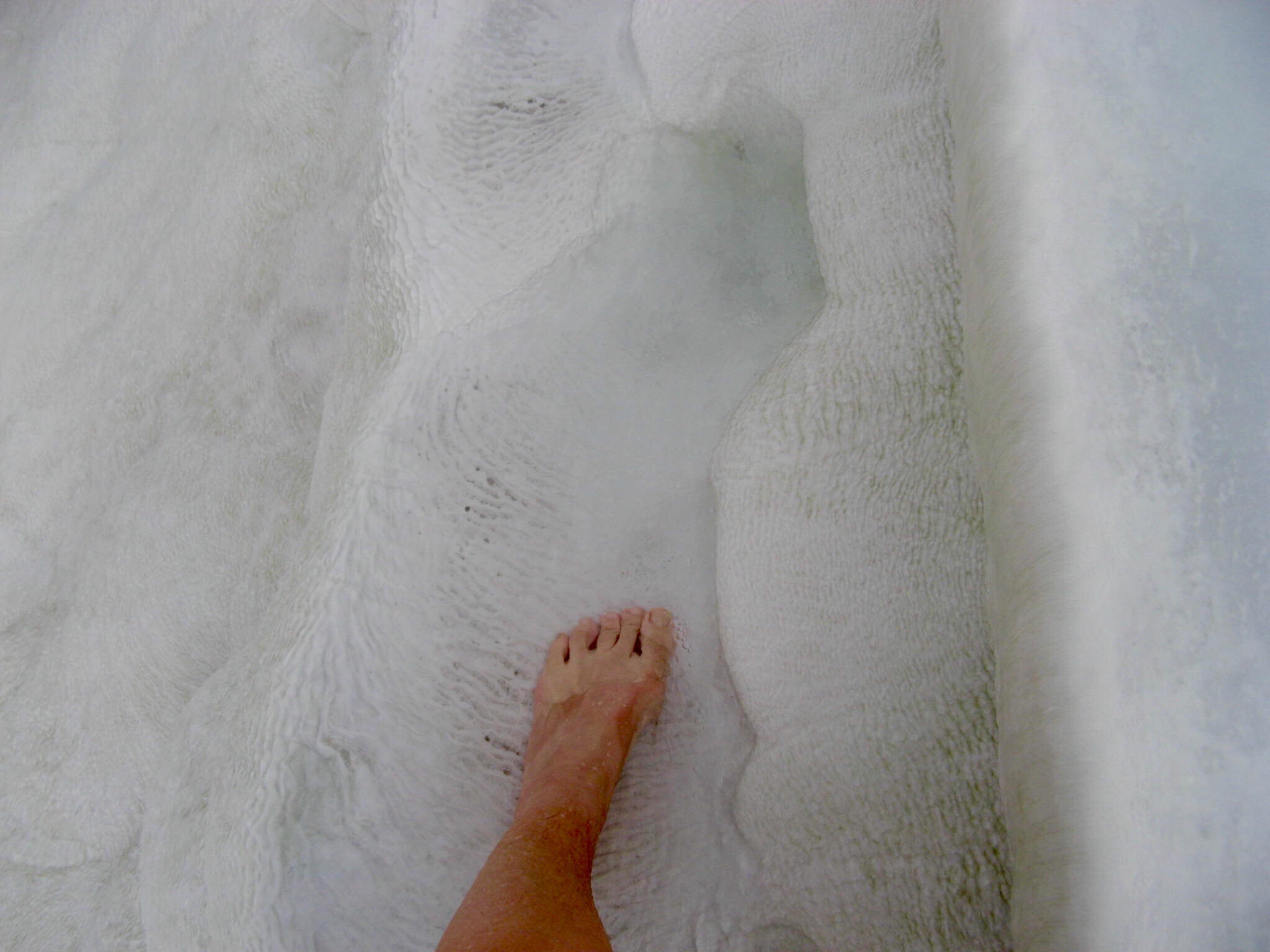 We climb the hill where the warm spring water leaves calcium carbonate deposits, making the ground hard and white. Visitors are required to walk barefoot so as not to cause ecological damage — even though the…