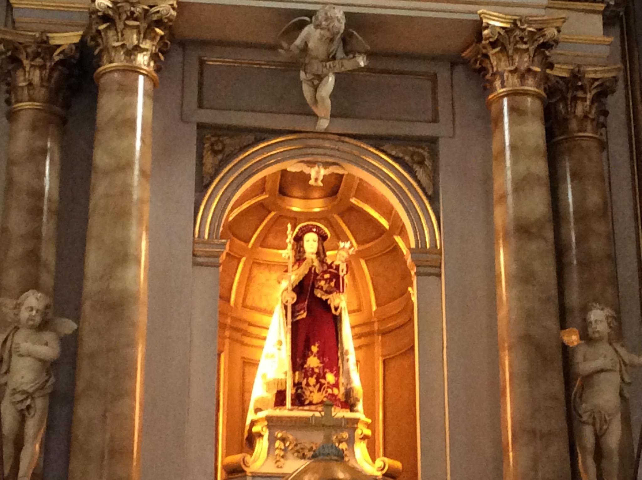 The other Marian sites had large areas for lighting candles. We know there must be one here, but haven’t seen it. We walked all around the church until we found this little area tucked away in a corner, with a flowing fountain. Very pretty and very peaceful.
