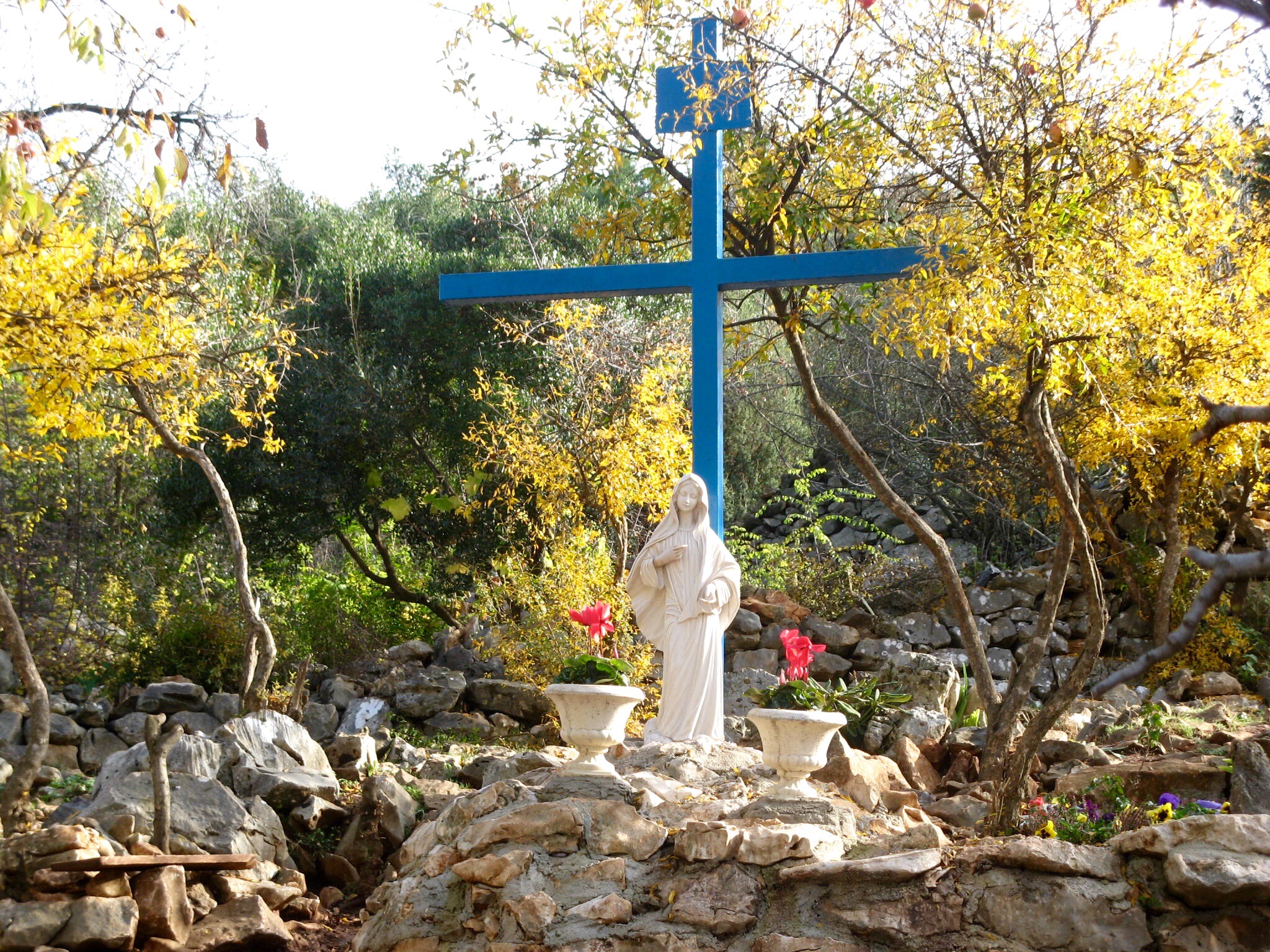 Behind the statue is a crucifix, where others kneel on the rocks.