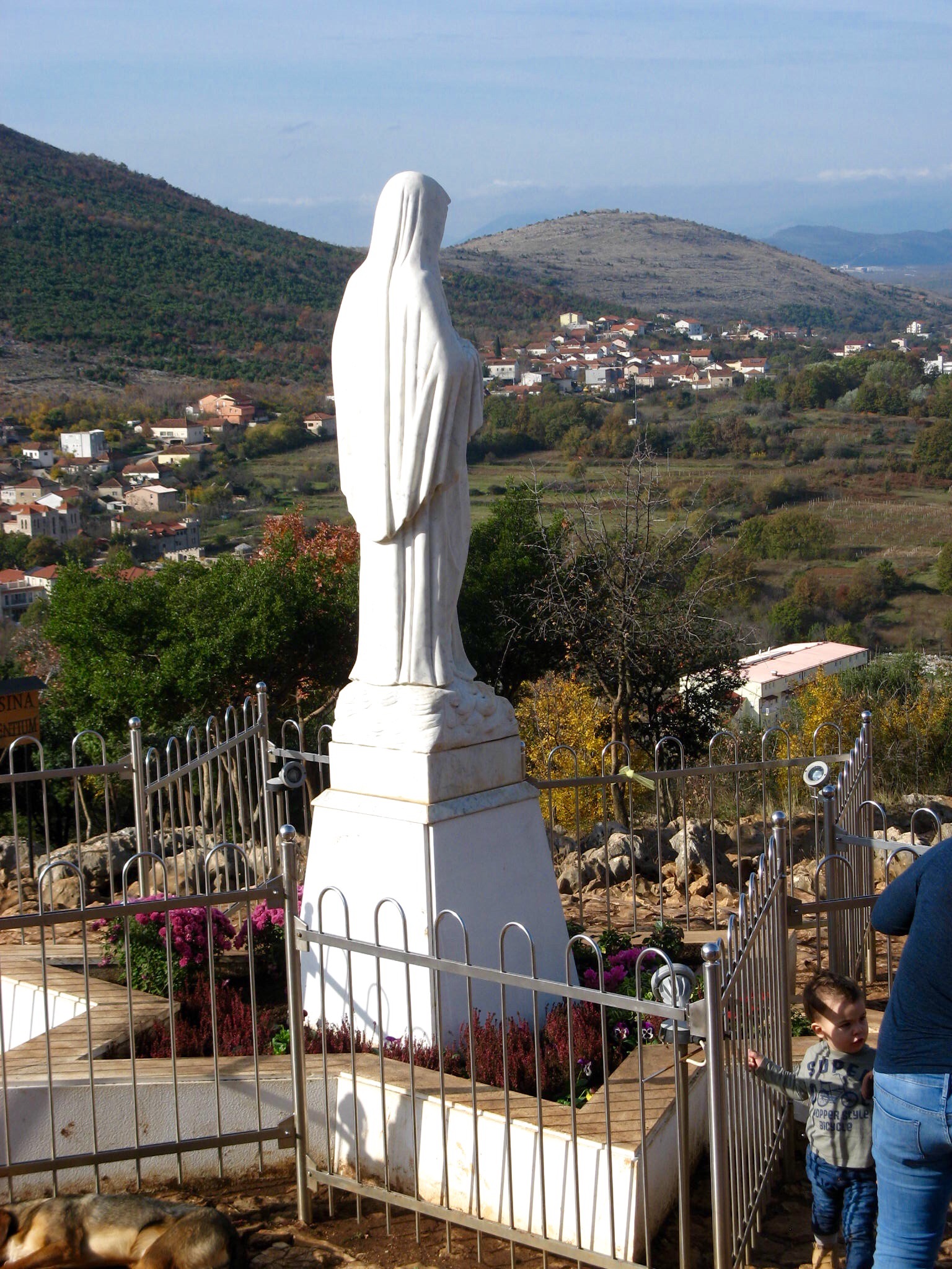 11/15 – another warm, sunny day, and my hip is feeling better. Today we will climb Apparition Hill, where the six teens first saw Our Lady, Queen of Peace. It’s a two mile walk to the base of the hill, past hotels, souvenir shops and cafes. We are concerned that there don’t seem to be enough pilgrims to keep all these places in business. There are several new buildings that look like construction was abandoned halfway.