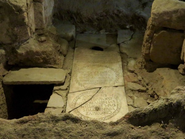 Then we were off to the Basilica of Santa Eulalia, a twelve year old virgin martyred for her Christian beliefs in the year 304.  Story goes that she taunted the Roman court and dared them to kill her.  They tried to talk her out of it, but ultimately obliged by burning her at the stake.  When she died, a dove flew out of her mouth.  The actual church was not open, only the Crypts below.