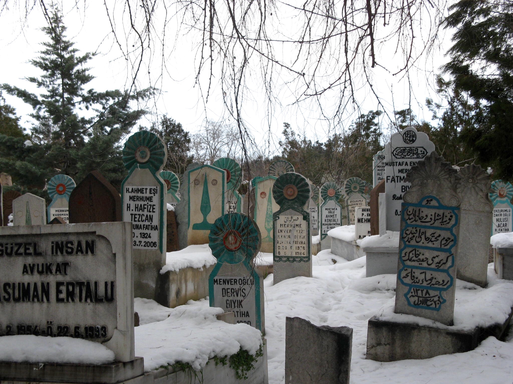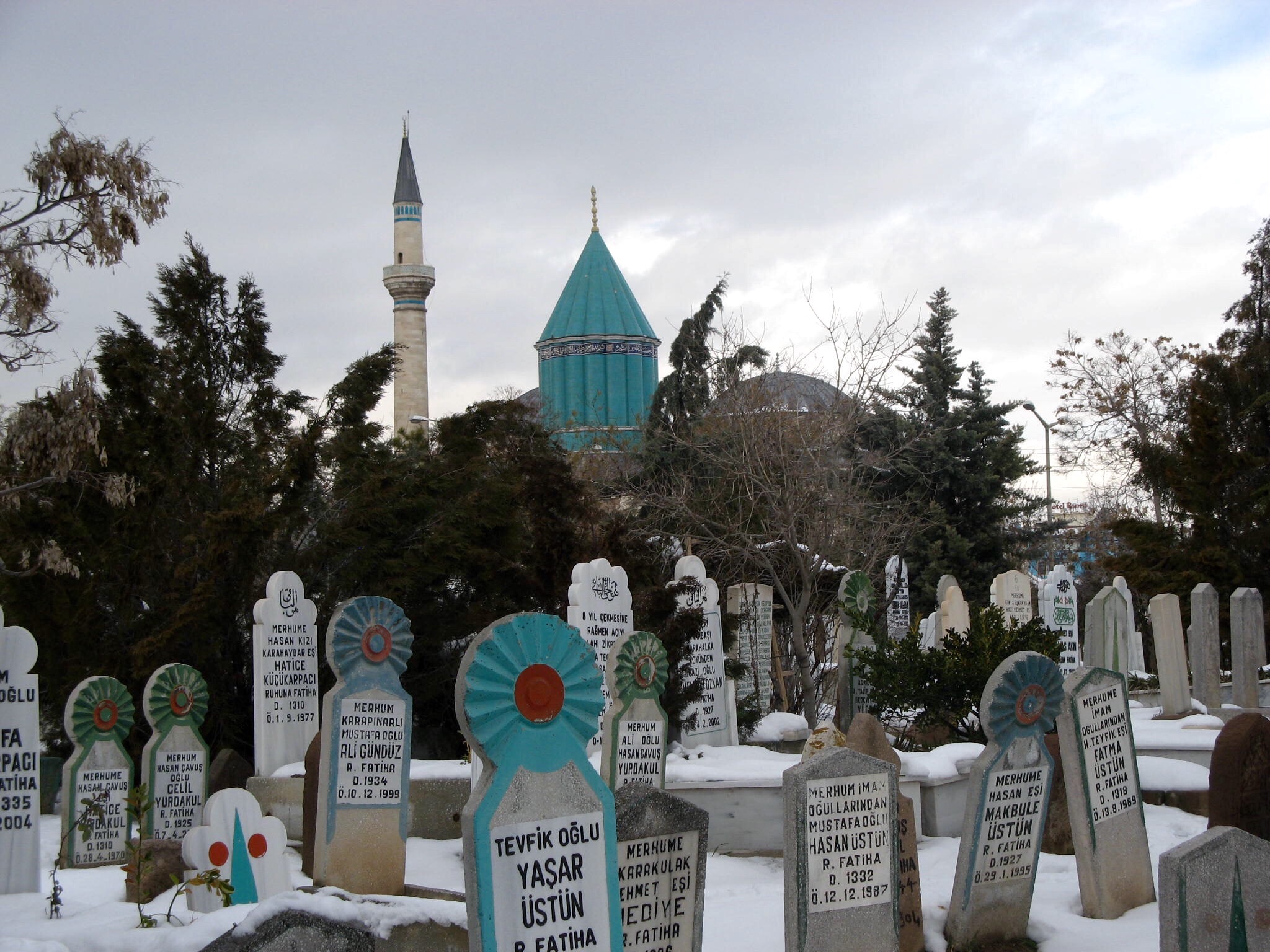We’re on our way to see Rumi’s tomb, at the Mevlana Museum. Mevlana means Master, and refers to Rumi. You can see the green spire (tower?) of the museum in the distance. The spire is the same color green as the decoration on the headstones. I looked online, but was unable to discover any info about this.