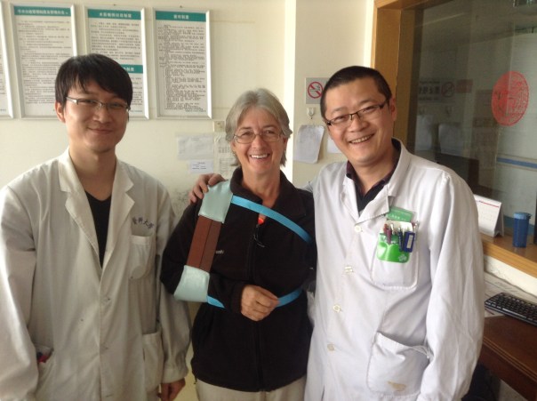 We waited in a hallway until we were called in to see a doctor, who concurred that I needed an X-ray. He called over a young resident who spoke some English, who took us upstairs and instructed us to wait until we were called. He asked if he could take our picture, as we were his first foreign patients!